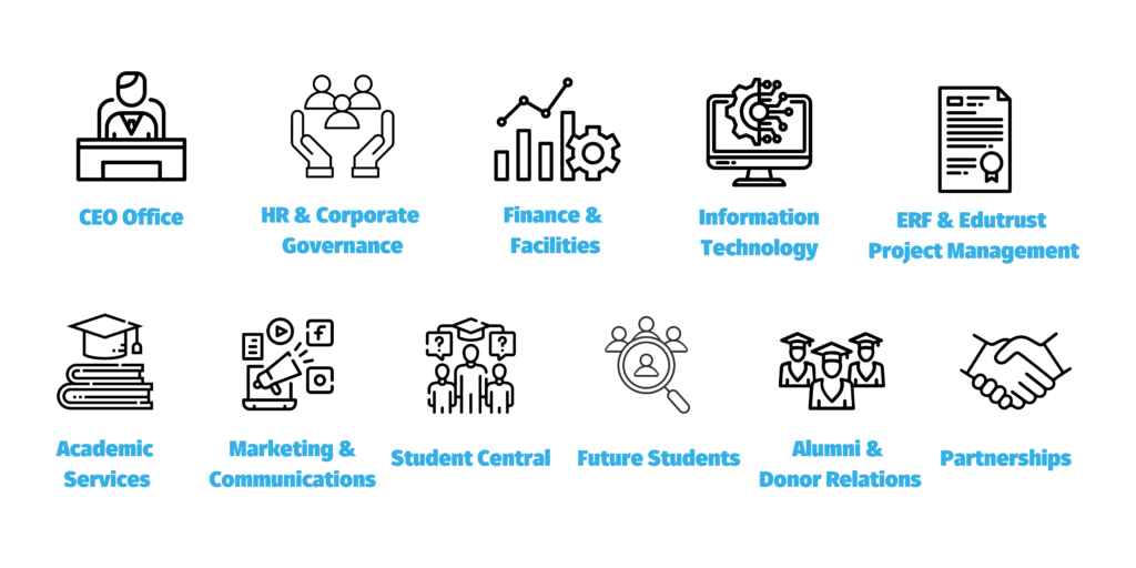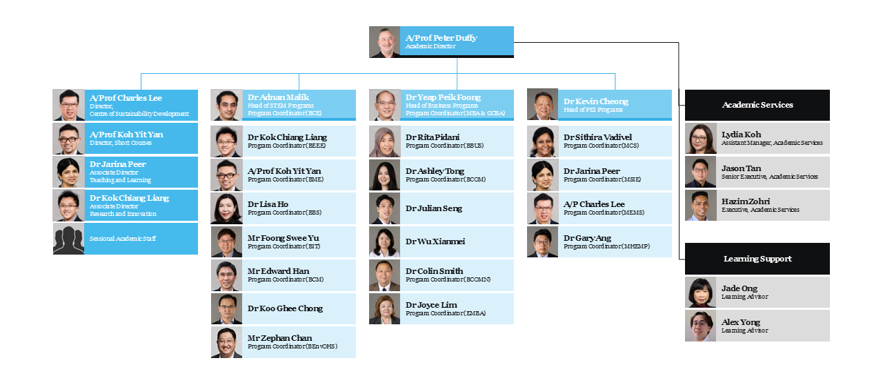 This dynamic team is supported by functional leads from human resources, finance, marketing, business development, and student admissions and enrolment through to graduation.